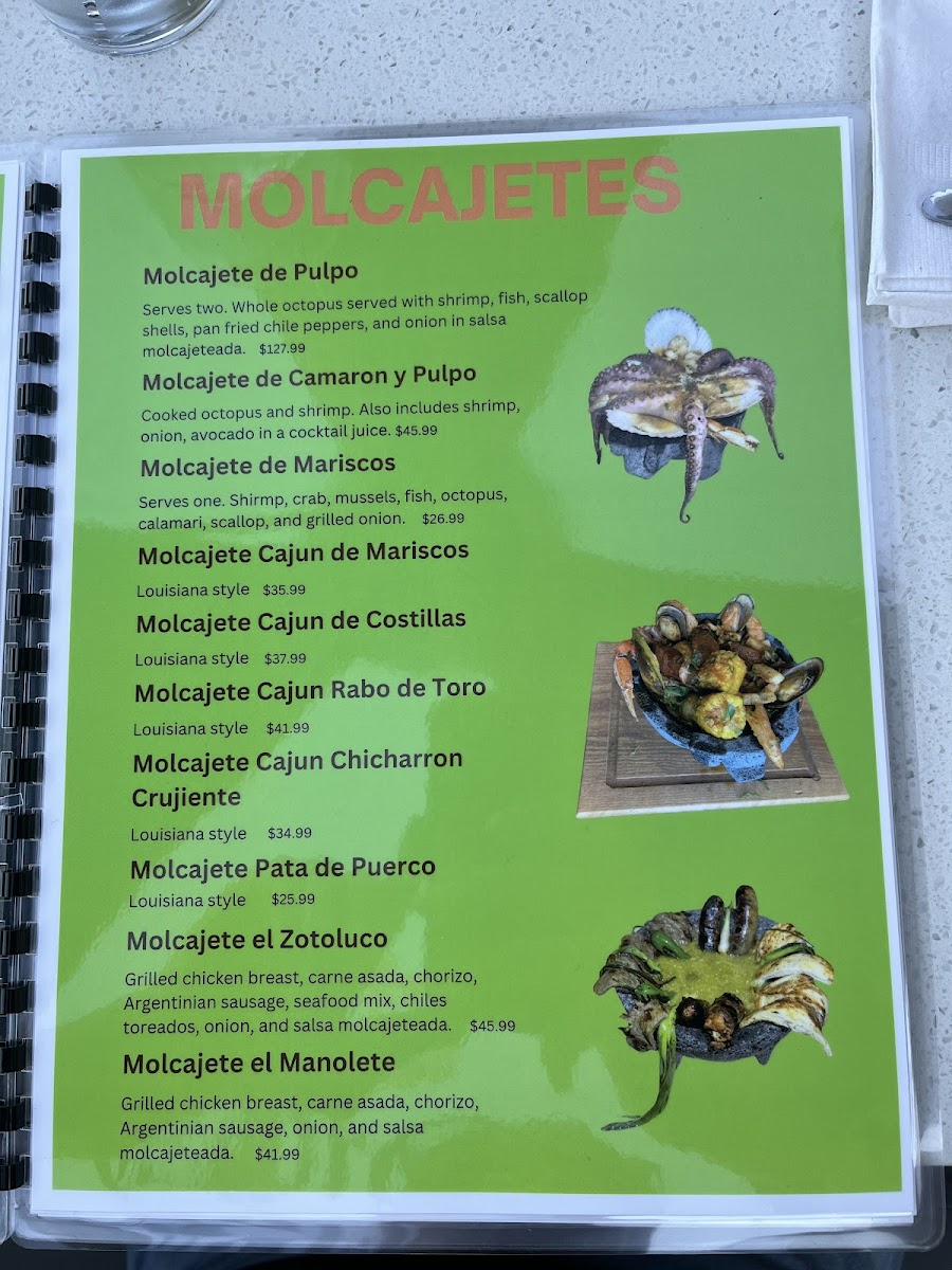 Serves two. Whole octopus served with shrimp, fish, scallop shells, pan fried chili peppers, and onion in salsa molcajeteada.