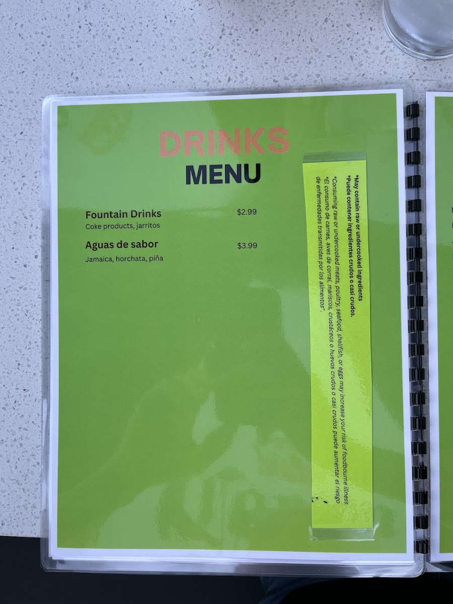 May contain raw or undercooked ingredients. / Puede contener ingredientes crudos o casi crudos. Consuming raw or undercooked meats, poultry, seafood, shellfish, or eggs may increase your risk of foodborne illness. / El consumo de carnes, aves de corral, mariscos, crustáceos o huevos crudos o casi crudos puede aumentar el riesgo de enfermedades transmitidas por los alimentos.