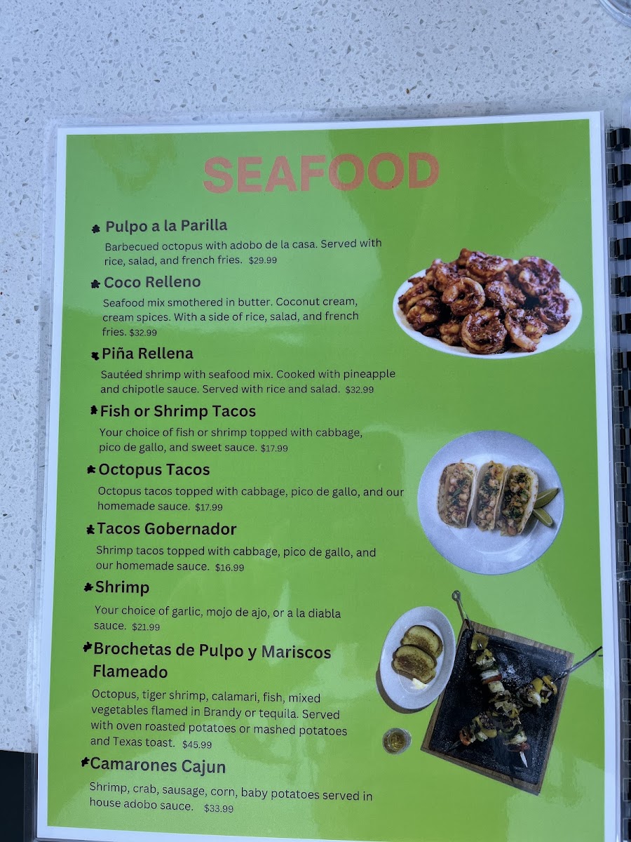 Your choice of shrimp, fish, or octopus. May contain raw or undercooked ingredients. / Puede contener ingredientes crudos o casi crudos. Consuming raw or undercooked meats, poultry, seafood, shellfish, or eggs may increase your risk of foodborne illness. / El consumo de carnes, aves de corral, mariscos, crustáceos o huevos crudos o casi crudos puede aumentar el riesgo de enfermedades transmitidas por los alimentos.