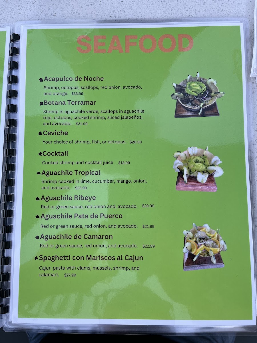 Shrimp in aguachile verde, scallops in aguachile rojo, octopus, cooked shrimp, sliced jalapeños, and avocado. May contain raw or undercooked ingredients. / Puede contener ingredientes crudos o casi crudos. Consuming raw or undercooked meats, poultry, seafood, shellfish, or eggs may increase your risk of foodborne illness. / El consumo de carnes, aves de corral, mariscos, crustáceos o huevos crudos o casi crudos puede aumentar el riesgo de enfermedades transmitidas por los alimentos.