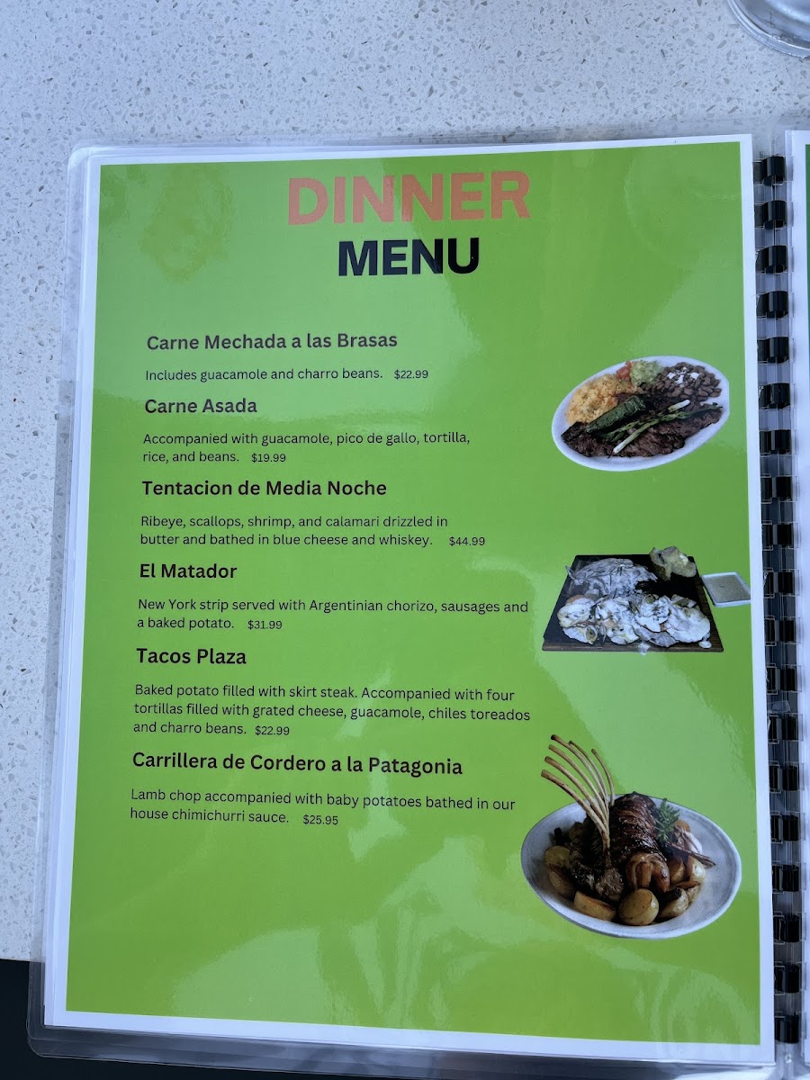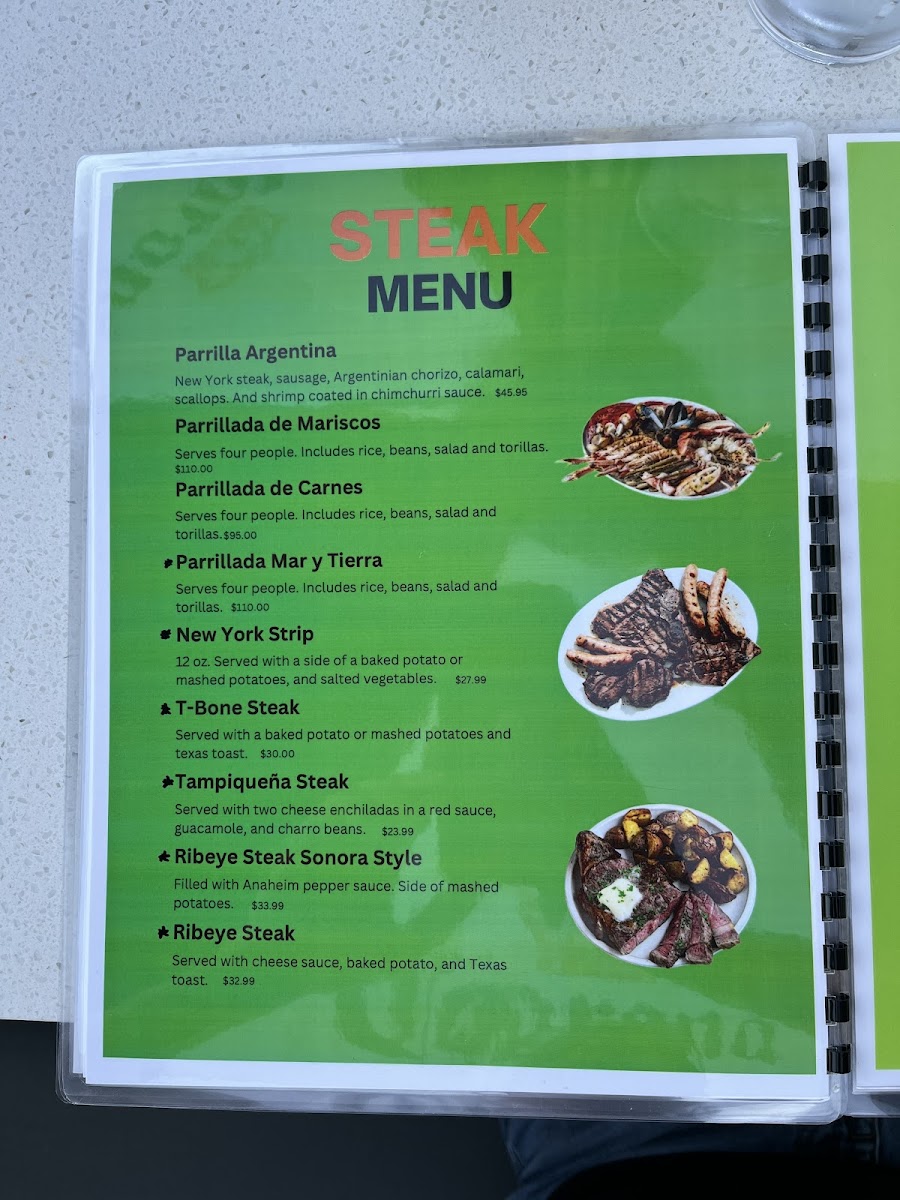 Served with two cheese enchiladas in red sauce, guacamole, and charro beans. May contain raw or undercooked ingredients. / Puede contener ingredientes crudos o casi crudos. Consuming raw or undercooked meats, poultry, seafood, shellfish, or eggs may increase your risk of foodborne illness. / El consumo de carnes, aves de corral, mariscos, crustáceos o huevos crudos o casi crudos puede aumentar el riesgo de enfermedades transmitidas por los alimentos.